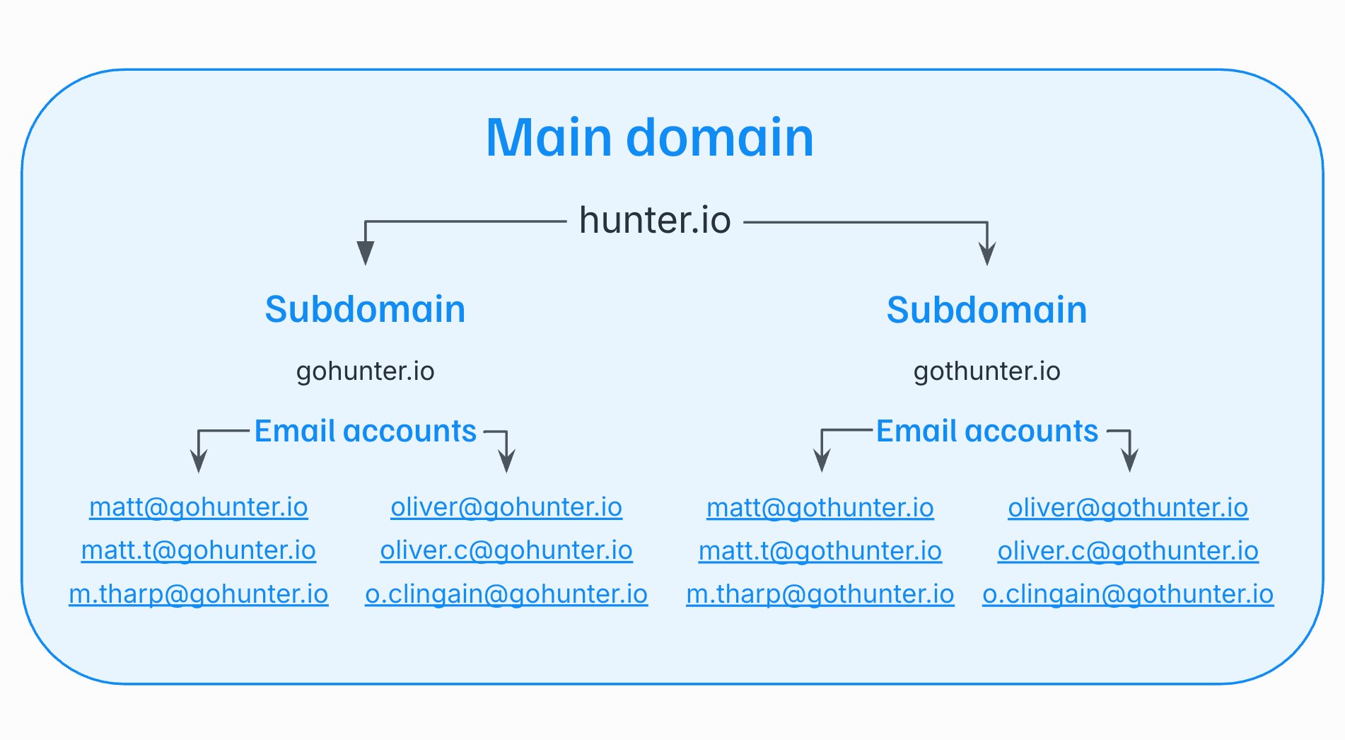 A subdomain sits beneath your main domain (e.g., mail.hunter.io). A similar or secondary domain is a completely separate domain that resembles your brand name (e.g., gohunter.io). Both serve the same purpose for outreach: protecting your primary domain's reputation.