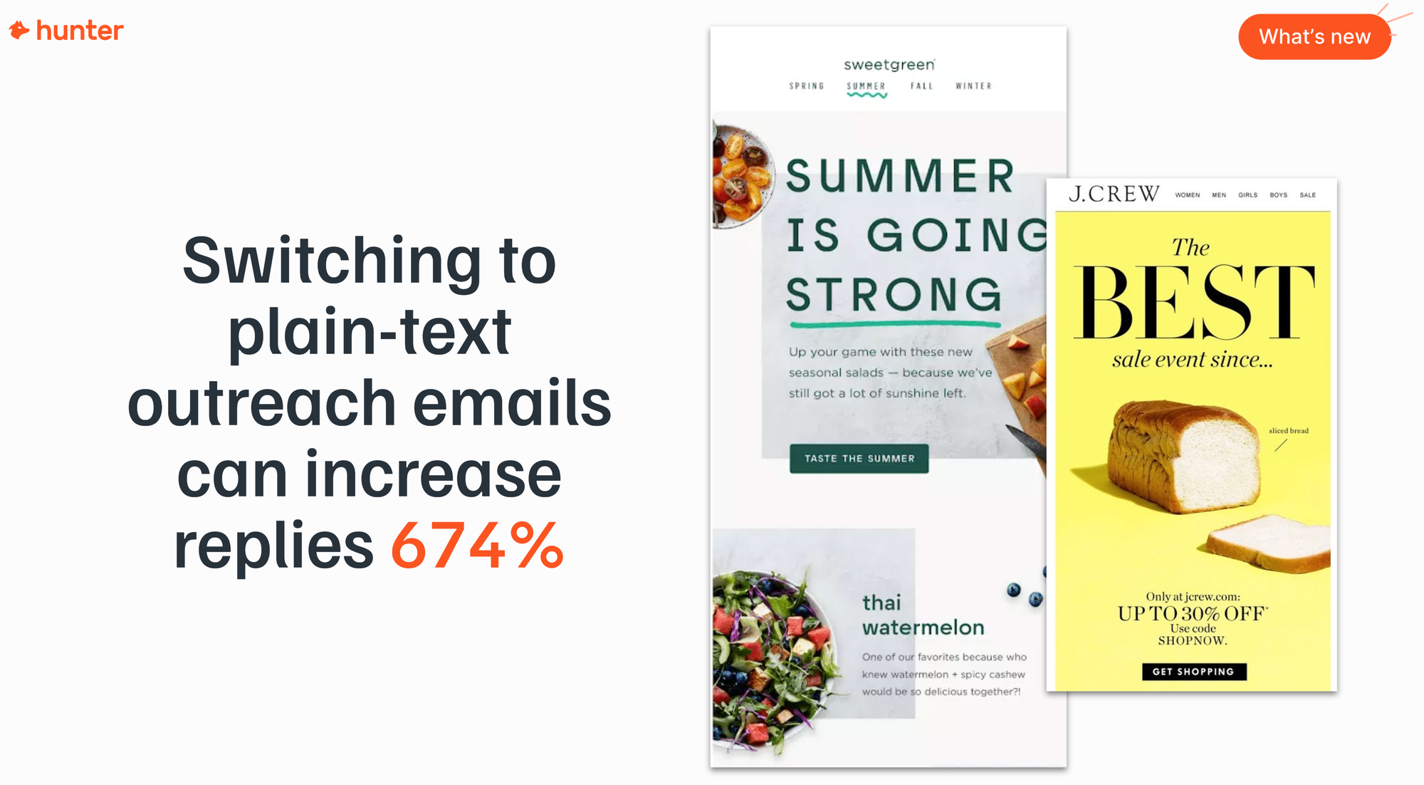Hunter's data shows HTML outreach emails bounce 674% more than plain text ones, so anything that pushes your email toward HTML moves it in the wrong direction.