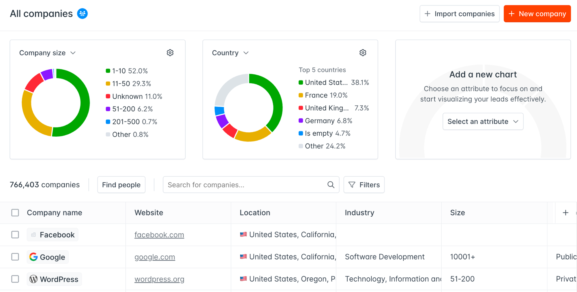 In Leads, you can segment by size, country, industry, and more.