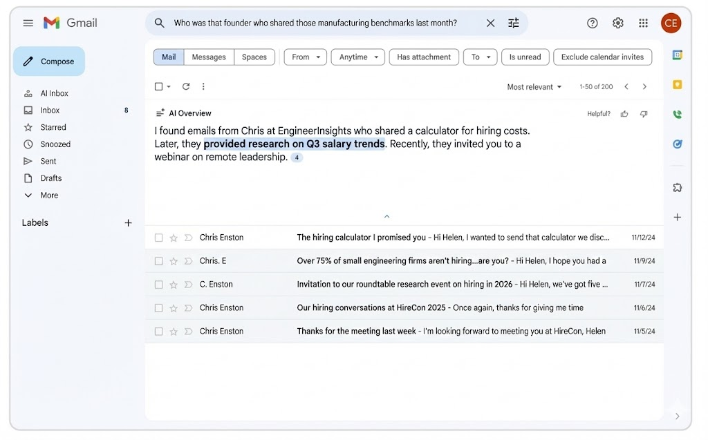 The update: Google’s AI now allows users to query their inbox with natural language. Instead of hunting for keywords, a lead can ask, "Who was the plumber that gave me a quote last year?" and get an instant answer.