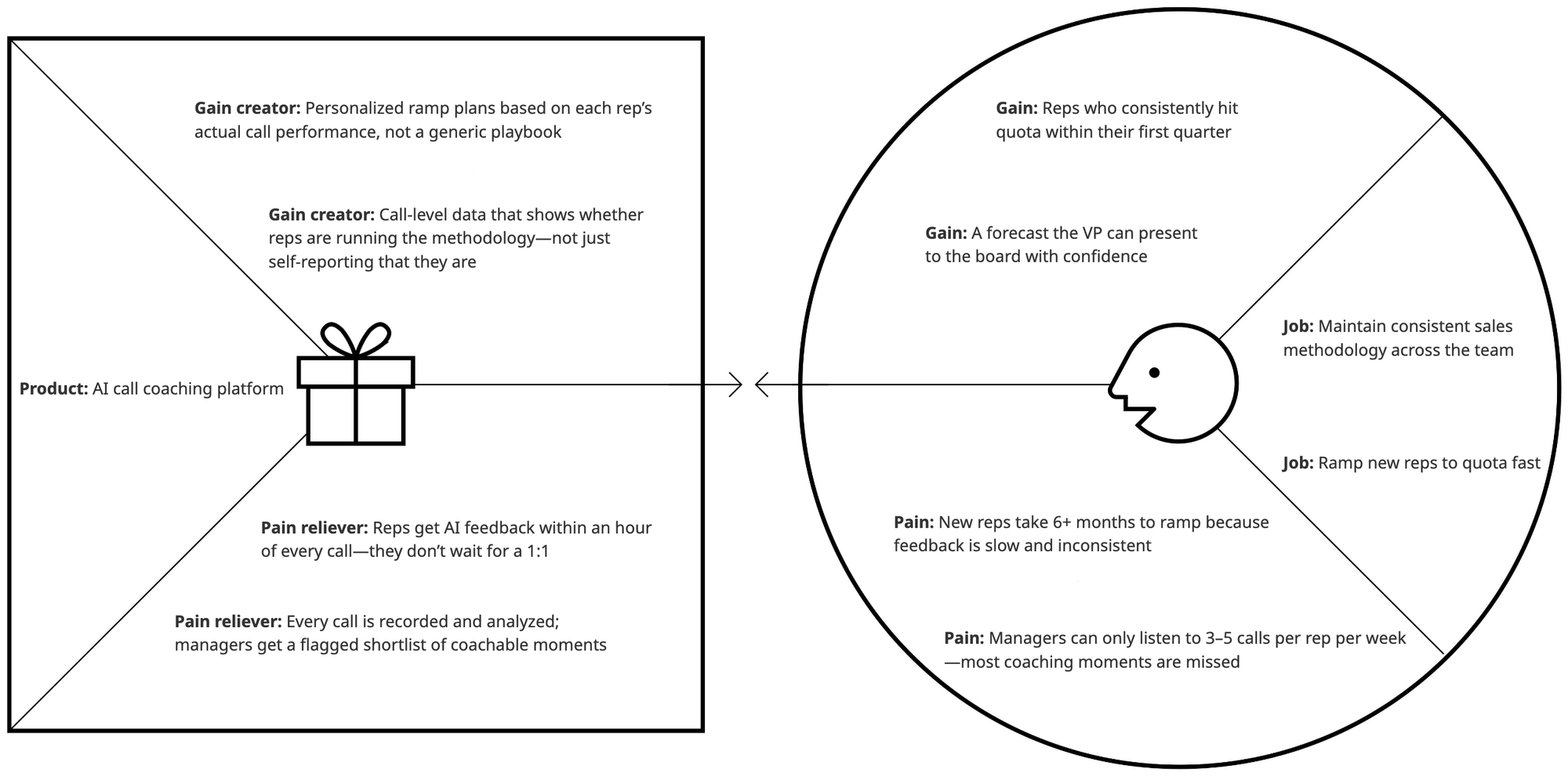 A VP of Sales is unlikely to reply to “we help sales teams ramp reps faster." They reply to “I can show you exactly where your new reps’ calls go off-track, based on a 10-call sample.” The first is about you. The second is about them, it’s concrete, and it’s something they can evaluate without committing to buy.