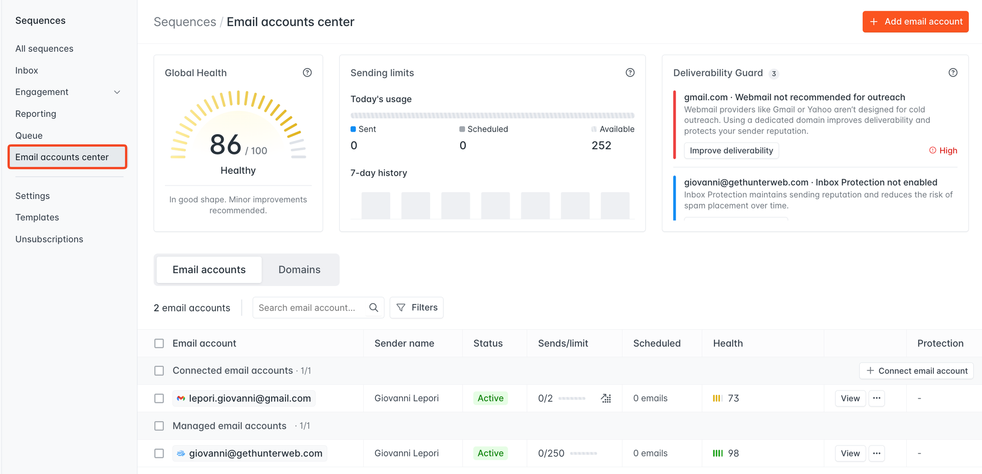 - See every connected account with its status, daily sending progress, scheduled emails, health score, and Inbox Protection status