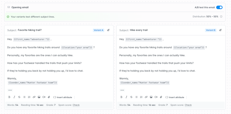 Hunter will automatically split recipients between variants and report which version of your email performs best.